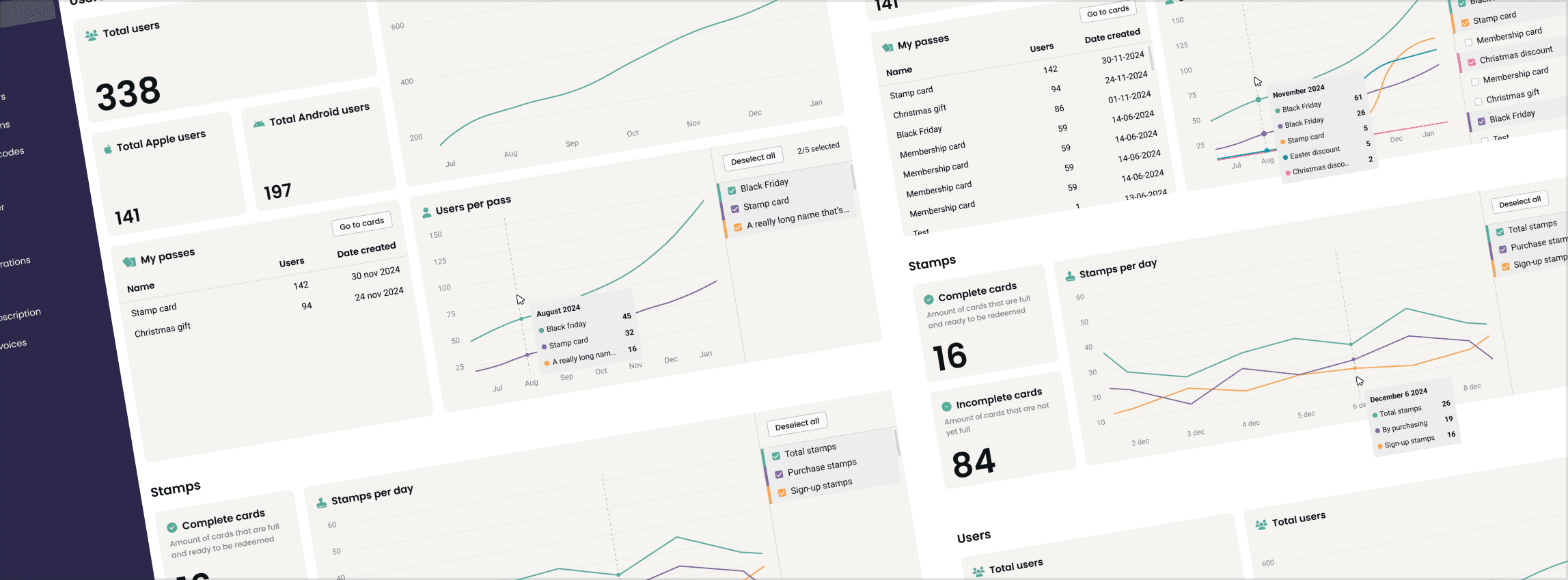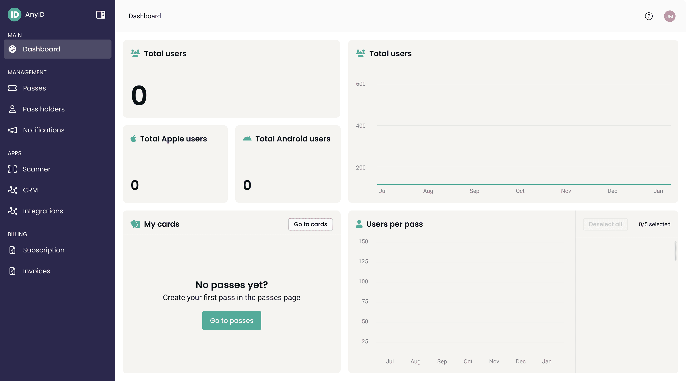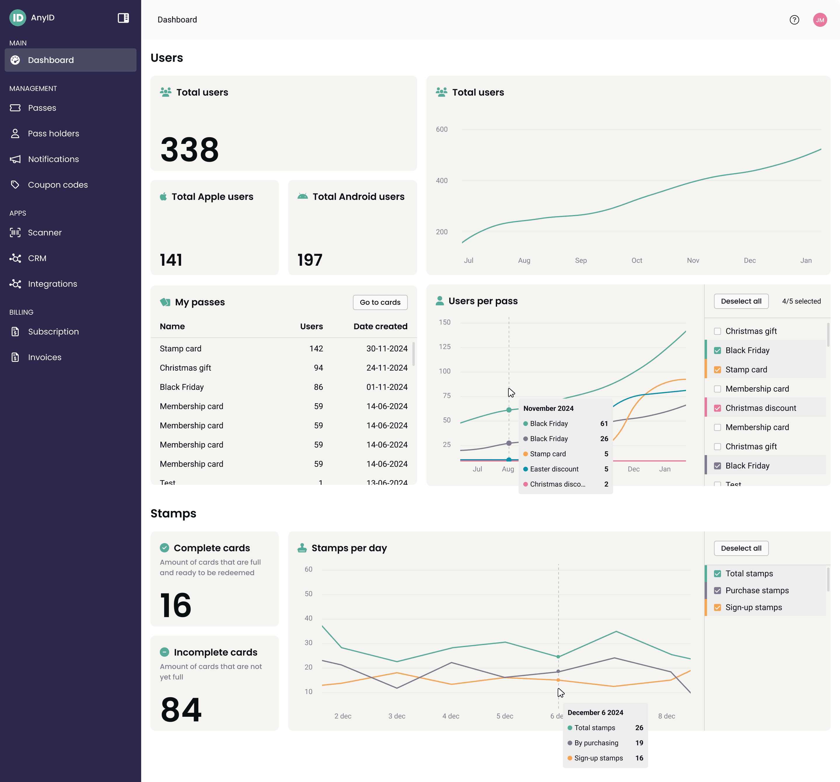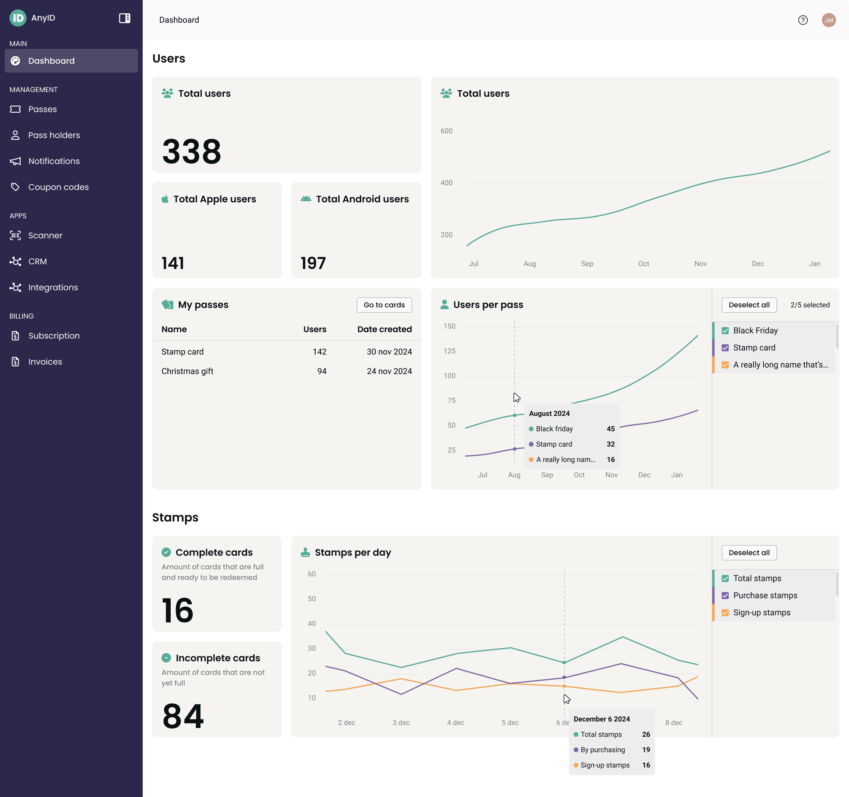 Voor de admin panel van de service van AnyID heb ik het analytics scherm gemaakt. Dit zijn de gemeten statistieken in de beginfase van dit project. Het scherm is zo ontworpen dat nieuwe analytics gemakkelijk toegevoegd kunnen worden aan het scherm. Daarnaast heb ik verschillende states uitgewerkt. De null states voor wanneer er nog niets te meten is, en voor wanneer er juist veel data te zien is.