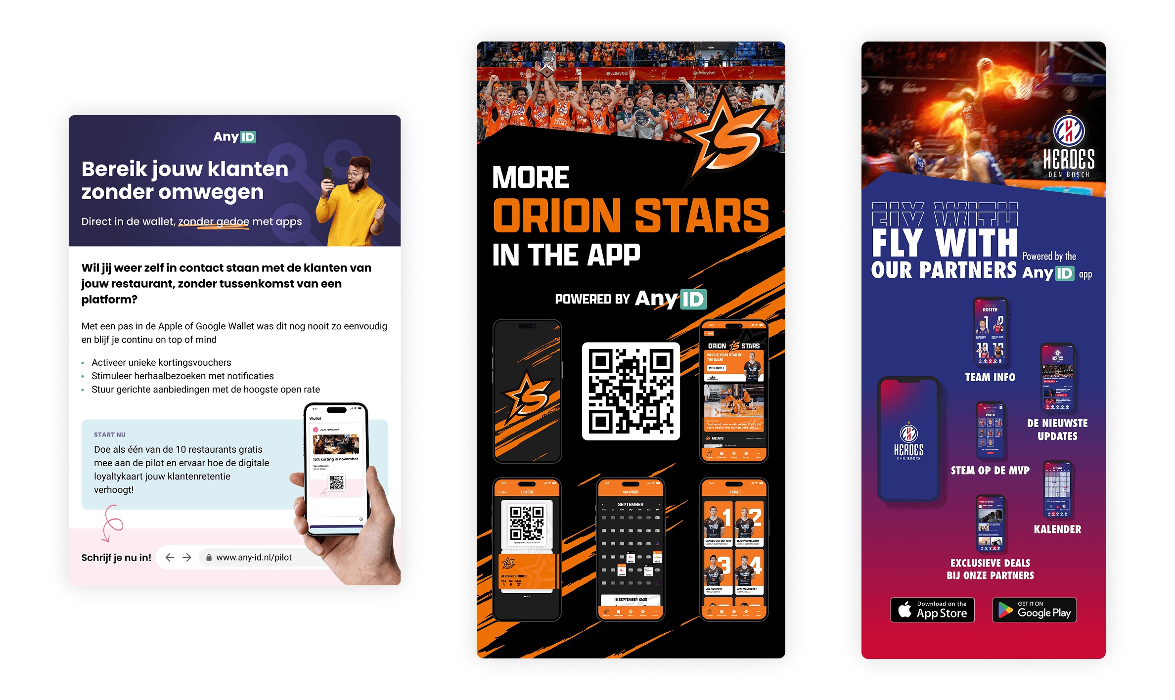 Voor het aankondigen van de launch van de Heroes Den Bosch app, de Orion Stars app en het benaderen van nieuwe klanten heb ik flyers en banners gemaakt.
