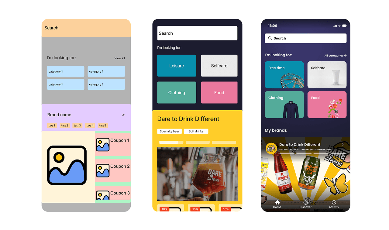 Alle gebruikers van de app zijn binnen gekomen voor één merk. Op dit moment zijn gebruikers alleen “verbonden” met hun eigen merk. Het doel is dat ze andere merken gaan ontdekken met als uitgangspunt iets te bestellen op hun webshop. De huidige ontdek pagina heeft een aantal problemen: