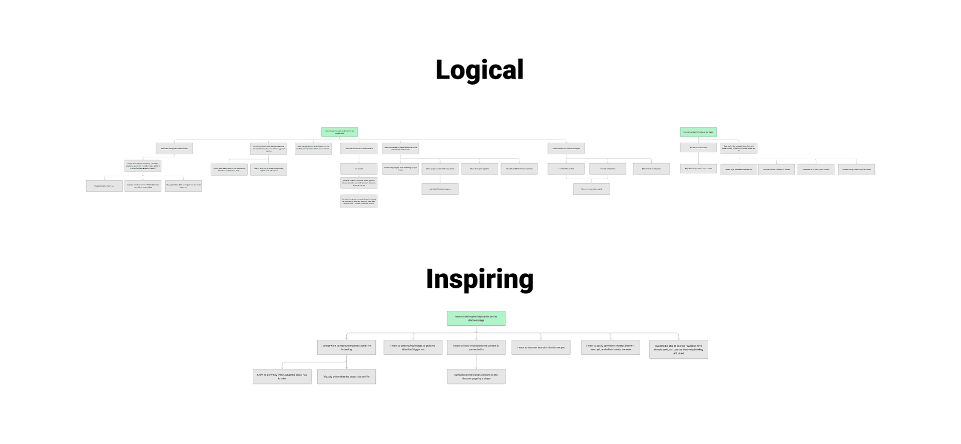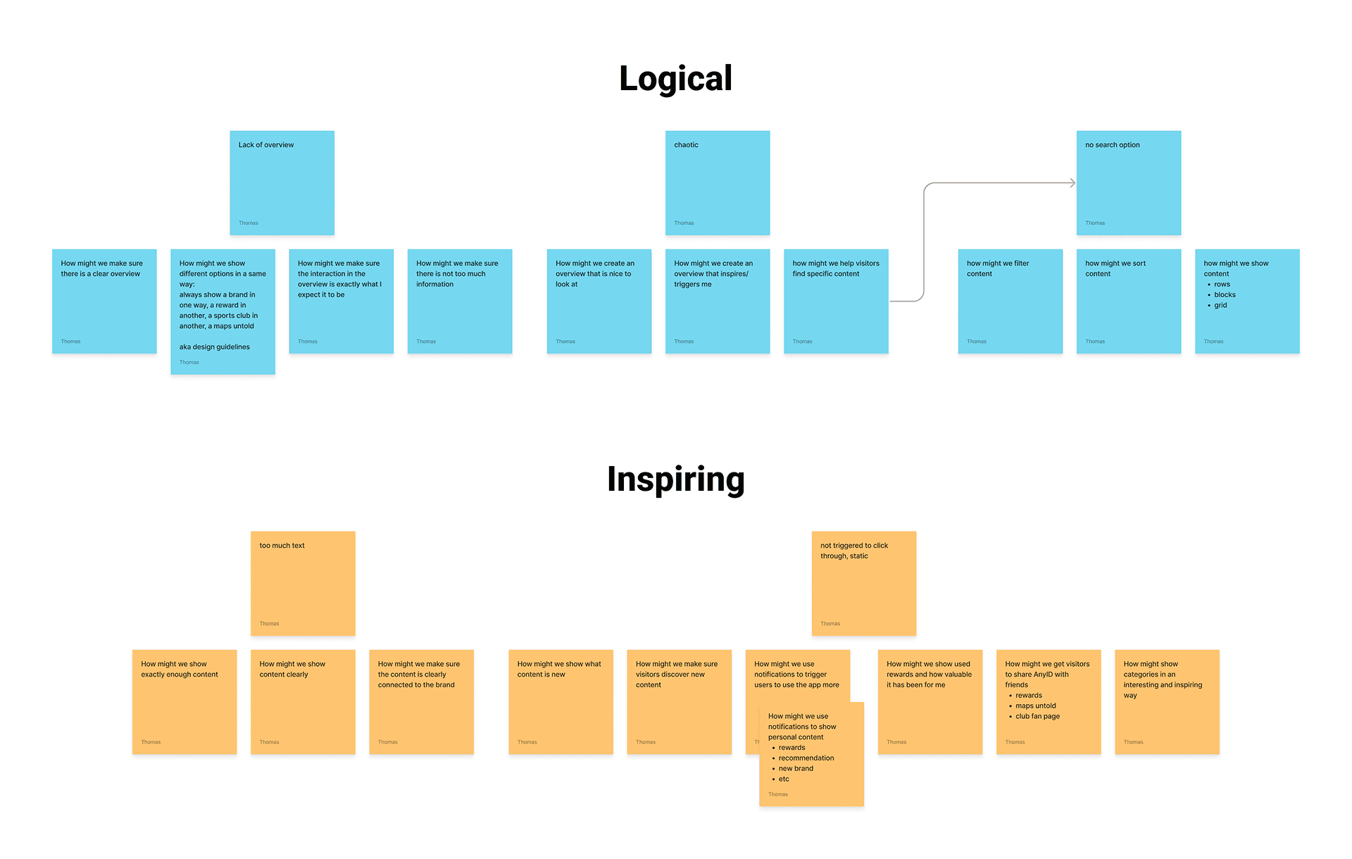 Vanuit deze knelpunten heb ik how-might-we’s gemaakt. Hierbij zijn de grootste twee focuspunten ‘Logical’ en ‘Inspiring’. De discoverpagina moet logisch zijn en intuïtief in gebruik, en moet daarnaast aansporen om de merken ook echt te gaan ontdekken.